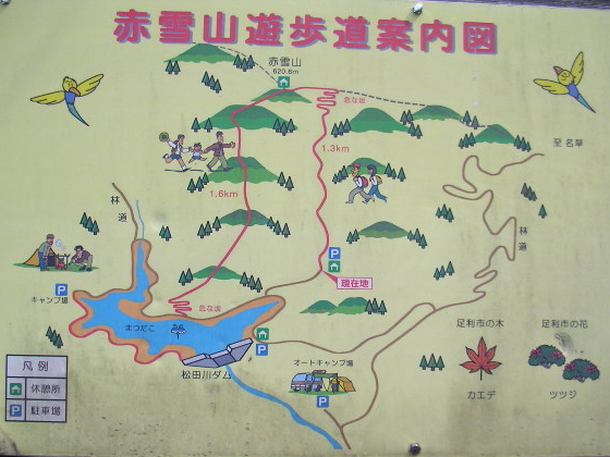 | 赤雪山は、足利で2番目に高い山です(1番は、仙人ヶ岳)。標高621m。 そして、映画「ガメラ2 レギオン襲来」で、仙台から地底に潜ったガメラが再び現れた山です。ガメラは、ここから南の葉鹿地区に下り、桐生に向かって、レギオンと戦うことになります。 このとき、自衛隊の本部がおかれたのが、この山の麓にある松田地区の旧松田小学校でした。いまは廃校となっています。2007年春、この学校はフジテレビのドラマ「ひみつの花園」(釈由美子主演)のロケでも使われました。 以上は最近の赤雪山にまつわる話題でしたが、赤雪山には、その名前に秘められた悲恋伝説があります。ちょっと長くなりますが、紹介します。 藤原秀郷の子孫 成行が両崖山に足利城を築き、足利と姓を変えます。これが藤姓足利氏の始まりです。 平治の乱の時代の城主は足利俊綱といい、足利荘は平重盛の所領となり、俊綱が管理していました。以来、藤姓足利氏は平氏に味方をし、源平合戦では、源頼朝の勢力が増大すると、足利俊綱は家臣の桐生六郎に殺されます。 その後、俊綱の子忠綱は、京にいて源氏と戦っていましたが、平氏が壇ノ浦で敗れ、足利に戻ってきます。足利荘は、源頼朝の義兄弟、源姓足利義兼の領地となっていました。 足利義兼は、妻である時子の侍女の藤野から、時子が忠綱と密通したという讒言を聞きます。実は、藤野は忠綱に心を寄せており、彼が受け入れてくれなかったためにとった行動でしたが、それを聞いた義兼は激怒し、忠綱を殺そうとします。 忠綱一族は難を逃れるため、足利の北方に向かって逃げてゆきます。しかし、行く手を山にさえぎられ、馬をおり、徒歩で山を登ってゆきます。折から降ってきた雪で逃げる足跡が残り、追っ手に発見され、忠綱は傷を負い、あたり一面の雪が真っ赤に染まったといいます。そこが赤雪山です。 そして、入飛駒の皆沢まで逃げてゆくのですが、討ちとられ、絶命し、藤姓足利氏は途絶えます。 現在、松田川ダムができてからは、ダムのそばの赤雪沢駐車場から登るのが一般的な登山ルートとなっています。しかし、ダムができる以前は、名草弁天から長石林道を越えるルートが使われていました。(2009.11/1 赤雪沢コースを追加) |