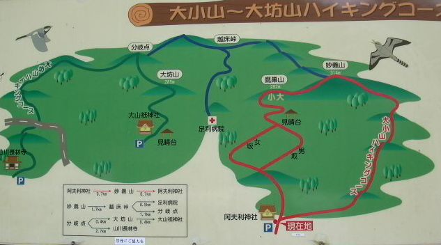 | 【南コース】地図へ 足利の展望の山 大小山へは、山麓の阿夫利神社を起点とした基本コースを始めとし、いくつかの登山ルートがあります。 |