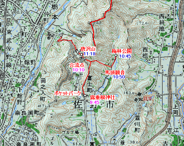 | 合流点 神社から、25分。 梅林公園からの道に合流します。 唐沢山へ南からは、 梅林公園、露垂根神社のふたつのコースがあり、 いずれも趣きがあるコースです。 ぜひ、こちらからも唐沢山に登りましょう。 |