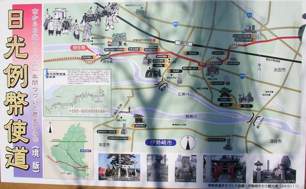 | 橋のたもとの案内板 この橋のたもとにも例幣使街道の案内板がありました。 伊勢崎市の例幣使街道の部分に案内板を建てたようです。 あると便利ですね。 >>案内図をクリックすると拡大表示します。 |