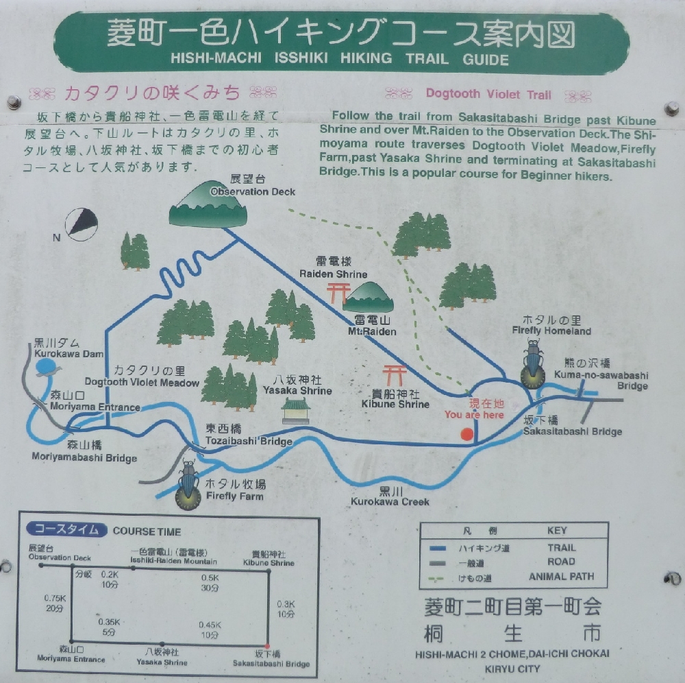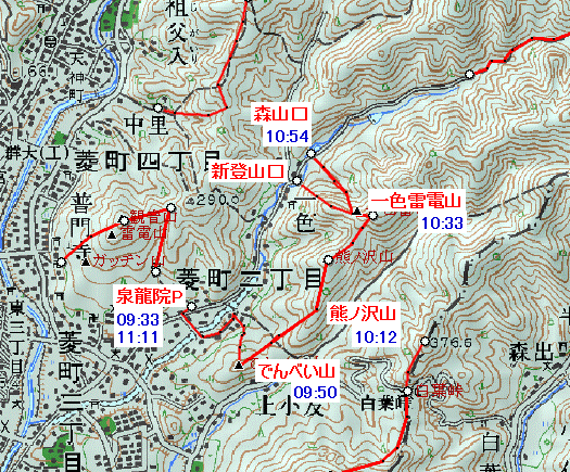 桐生の東の菱町にある泉龍院駐車場から、でんべい山(羽場山)、熊ノ沢山を経由して、一色雷電山の展望台から森山口に下山するコースを紹介します。 このあたり、春には、あちこちでカタクリが見られるようです。 でんべい山 標高230m、熊ノ沢山 標高276.4m(取材日 2017.3/29 水)。 県道桐生坂西線の桐生川の東の泉龍院を目指してゆきます。桐生市街から黒川の手前までゆくと北側に泉龍院の案内板がでていますので、それに従って、県道の途中から北に向かいます。クルマは、同寺の駐車場を利用させていただきます。 |