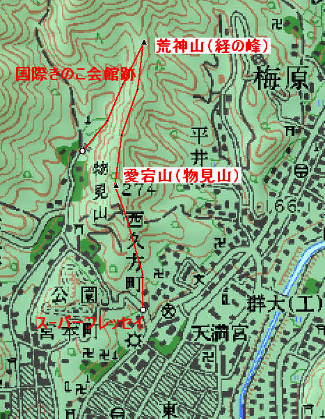 | 桐生の天神町、群馬大学の北、かつて国際きのこ会館の建っていた山、荒神山です。 かつて、西の観音山等から、西に見える吾妻山の北の小高い山に白い建物の国際きのこ会館がよく見えました。 しかし、2008年ころ解体され、いまはもう見えません。別名 経の峰。標高220m。(取材日:2009.7/18 sat) 桐生の本町通りを北に向かい、天神町の交差点のすぐ北にスーパー フレッセイがあります。 その駐車場にクルマをおかせていただき、スタートです。 |